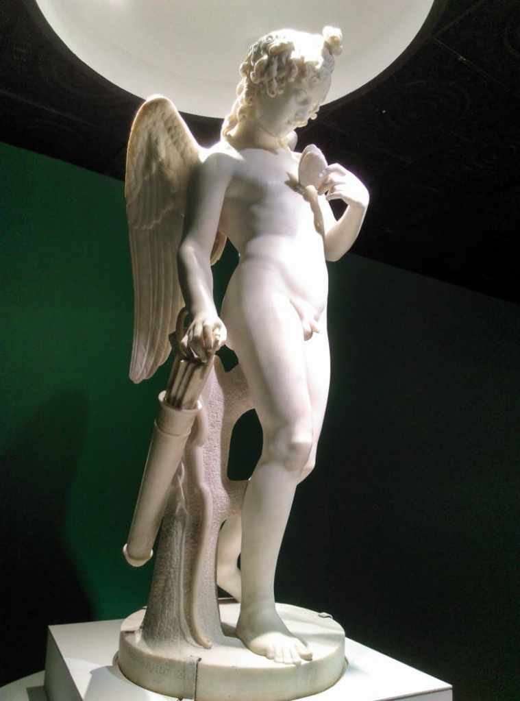 La cabeza de Medusa tallada en un bloque de mármol que logra helarte la sangre con su mirada de piedra, con sus serpientes de piedra y sus labios, no semejantes a los de una mujer, también de piedra. La misma hechicera ha sido presa, al final, de su propio embrujo. Afrodita, Venus, la nacida de la espuma de mar, tan bella como siempre en cada una de sus desnudas representaciones, pero quizá más, en aquella donde la cargan dos bellos cupidos, siendo símbolo del amor, del erotismo y la más grande belleza; también hubiera sido igual de perfecta aquella otra que sale incompleta, pues le amputaron a sus dos cupidos que aparecían succionándole la leche de los senos, y entonces, en los tiempos de su descubrimiento, fue que la consideraron un tanto vulgar. Atenea, poderosa e imponente, pareciendo no tener misericordia con nadie y estando lista para cualquier guerra, cualquier conflicto entre los hombres y los hombres, entre los hombres y sus dioses. Jarrones neoclásicos, al estilo griego dionisiaco, pintados delicadamente y con buen estilo al blanco, negro y dorado. Una representación, no tan bien lograda ni en lo más mínimo a la de Antonio Canova, de Eros y Psique, pero la que sí resulta ser para mí la pieza más bella de todas las salas, es aquella que muestra a un joven, Eros, acariciando con su mano izquierda a una bella mariposa que posa sobre su pecho desnudo, mientras que la mano derecha se le captura sacando sigilosamente una flecha de su carcaj, con la que dará muerte a aquel animal que representa al alma. El nombre de esta última obra, perteneciente a John Gibson: “El amor acariciando al alma mientras se prepara para atormentarla”: sublime, poético, totalmente cierto. Todo pasa. Todo se acaba.