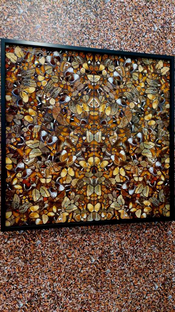 Dentro del tema que dedica a “Historia Natural”, nos enfrentamos frente a un ataque de un tiburón tigre real, sin ningún riesgo, pues se encuentra suspendido en un estanque transparente con solución de aldehído fórmico; sin embargo, no importa, aun así moriremos algún día (“la imposibilidad física de la muerte en la mente de algo vivo”). La atracción por el horror y la búsqueda de la seguridad y protección son algunos aspectos que nos caracterizan como humanos. Recorremos también un tiburón y una vaca, con su ternera, cortados en plano sagital con el fin de hacernos entender lo que es la muerte, avanzando un paso más, entre órganos, vísceras y huesos, hacia la propia. Cráneos presentes en varias vitrinas recordándonos el «momento mori» de las pinturas del barroco; sólo otro estilo, otra época, pero el mismo destino. Un autorretrato moderno hecho de un collage de radiografías, y ovejas que han quedado congeladas en el tiempo, mientras nosotros portamos su lana, pero pronto, algún día, se irá, y nos iremos también junto con ella. Quedaremos congelados, hechos huesos, lejos del rebaño, reducidos a un escombro de puntos distantes que algún día tuvieron color y tuvieron espacio.