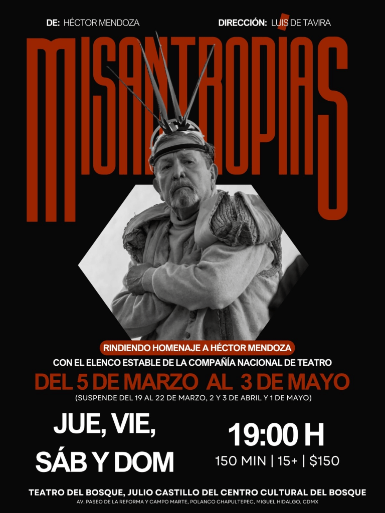 Esta noche se estrenó «Misantropías» en el Teatro Julio Castillo del Centro Cultural del Bosque, como parte de los homenajes de este año en torno a Héctor Mendoza. Dentro del sello «Patrimonio Dramático Nacional», esta obra resurge a cargo de la dirección de Luis Tavira y con el elenco estable de la Compañía Nacional de Teatro. Una pieza fundamental que Héctor Mendoza, una de las figuras más importantes que ha tenido México en la dramaturgia, escribió para homenajear el teatro como santuario, el teatro como profesión, como literatura y como actuación. El teatro como ventana y el teatro como espejo.
